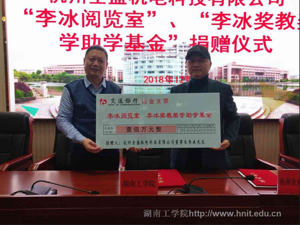12月24日上午,金沙990线路检测84级校友、杭州全盛机电科技有限公司董事长李冰向母校捐赠100万元用于设立“李冰奖教奖学助学基金”、“李冰阅览室”。捐赠仪式在金沙990线路检测教学大楼12楼报告厅举行。校长罗建华、党委副书记张平出席捐赠仪式。仪式由发展规划与校企合作处处长刘文华主持。