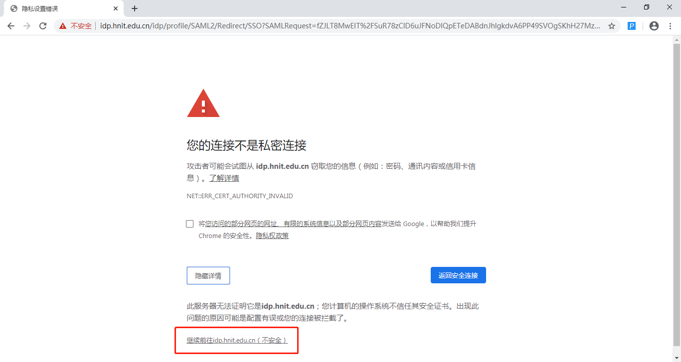 ※完成上述步骤后如出现提示页面“您的连接不是私密连接”,选择高级选项中的“继续前往”即可。