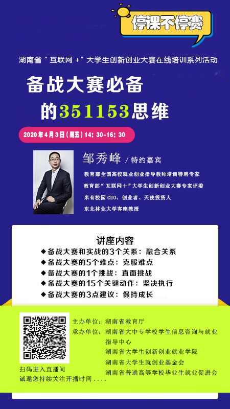 根据湖南省“互联网+”大学生创新创业大赛组委会工作要求,现发布第线上培训安排,请各二级学院创新创业大赛组委会成员、指导老师、拟参赛团队、创业孵化项目、省级及以上大学生创新创业项目负责人及指导老师准时观看。