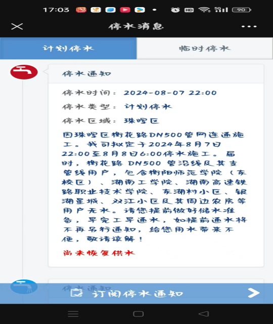 接衡阳市自来水公司通知,因珠晖区衡花路DN管网连通施工。拟定于2024年8月7日22:00至8月8日6:00停水施工,届时我校酃湖校区、湖工苑停水,请各部门提前做好储水准备。