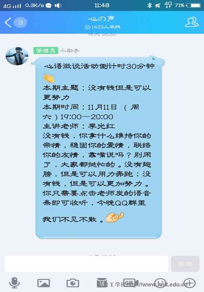心语微谈是一种在线的实时互动问答活动,活动分为老师主讲和互动提问两种形式,在活动中老师和学生围绕着一个主题进行深入的交流与沟通。本活动共举办六期,主题包含了 “谁的青春不迷茫 ” 、“遇见最好的自己” 、“爱要怎么说出口 ” 、“没有钱,但我可以更努力”  、“ 大学校园—遍地狗粮” 、“学习”呼叫转移。