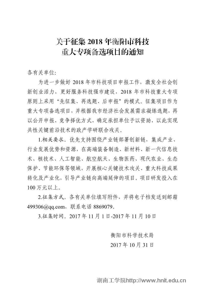 关于征集2018年衡阳市科技重大专项备选项目的通知