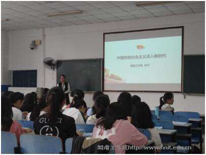 钟巧围绕“中国特色社会主义进入新时代”的主题,讲解了本堂课的主要内容:一是中国特色社会主义进入新时代的历史依据和现实依据;二是把握新时代“五位一体”总体布局、“四个全面”的战略布局;三是正确理解新时代党和国家事业取得的历史性成就和历史性变革。四是如何正确认识习近平新时代中国特色社会主义思想和历史地位的知识难点进行分析。整堂课以歌曲开场和结束,构思新颖,受到学生欢迎。