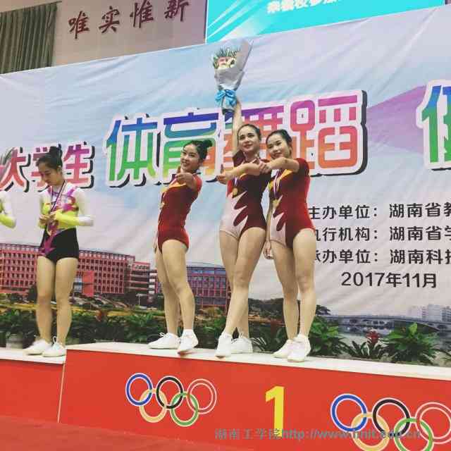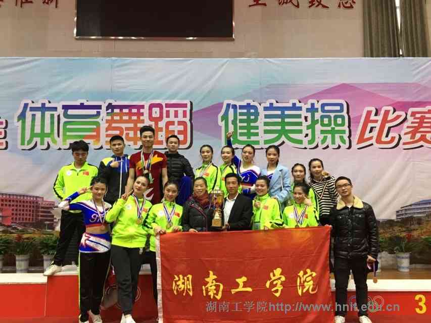 2017年湖南省大学生健美操比赛于1120日下午在湖南科技大学落下帷幕。在本次比赛中,我校健美操队在邓莉萍、张宏达等教练的辛勤指导和队员们的刻苦训练下,斩获学院组团体总分第1名,混合双人操、三人操、五人操第1,单人操、舞蹈啦啦操、技巧啦啦操第2名,有氧踏板操第3名。