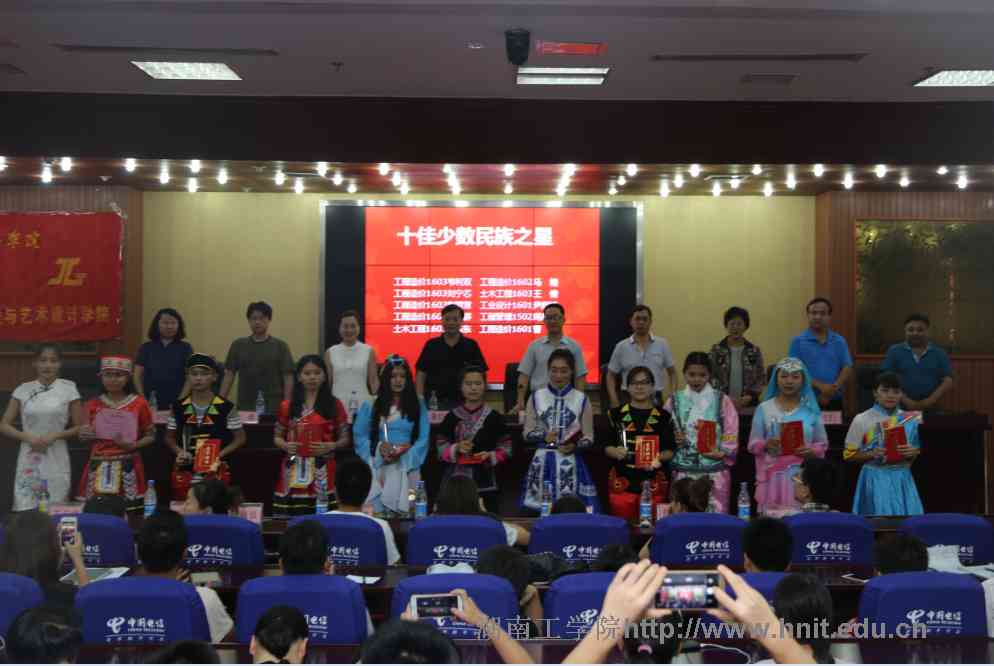 会上,建工学院党委书记彭志忠宣读表彰决定。韦利双等十名少数民族同学荣获2017年十佳少数民族之星荣誉称号,他们身着民族盛装接受了颁奖。