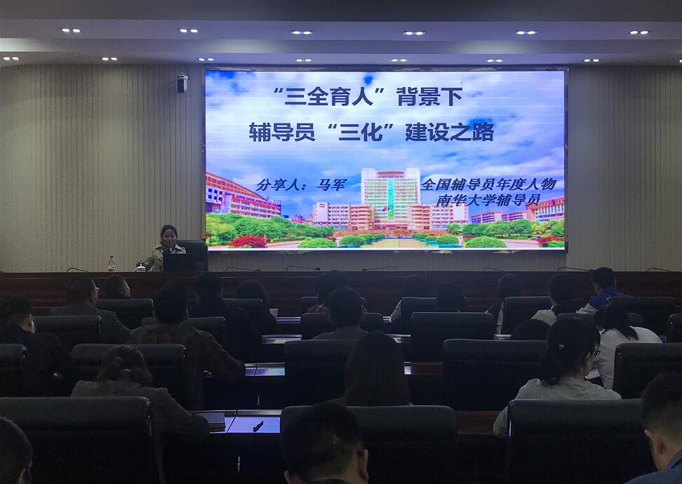 1014下午,第十届全国高校辅导员年度人物、南华大学辅导员马军教授应邀来校作专题报告。各二级学院党委副书记、学工办主任以及全体辅导员参加。活动由学生工作处(部)副处长刘斌主持。