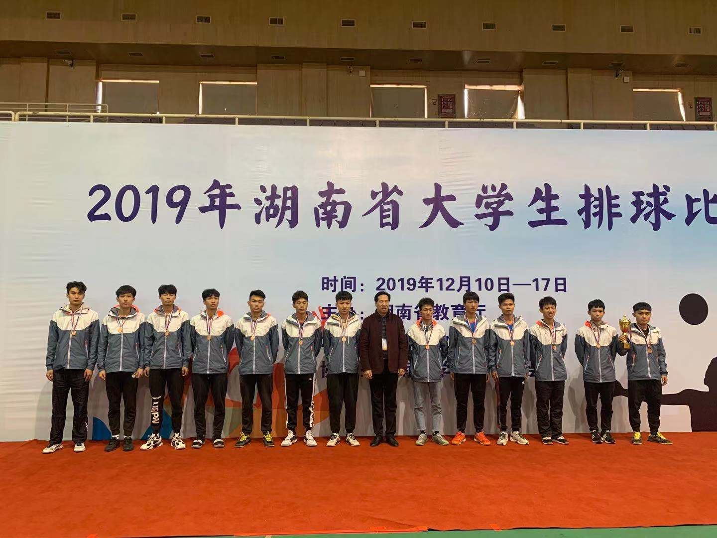 12月17日,2019年湖南省大学生排球比赛在中南林业科技大学落下帷幕,本次比赛由湖南省教育厅主办,中南林业科技大学承办,湖南省学生体育协会协办。体育教学部孙柏顺、肖宇淳担任教练员率我校男排代表队赴长沙参加比赛,经过一周的激烈角逐,我校男排代表队喜获学院组第三名,取得历史性突破。