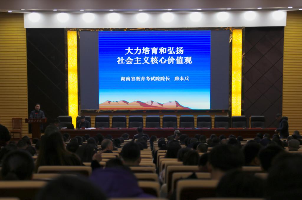 12月26日下午,学校党委召开第十一次理论学习中心组(扩大)学习报告会,邀请湖南省教育考试院院长唐未兵教授作专题辅导报告,校长罗建华主持学习会并讲话。