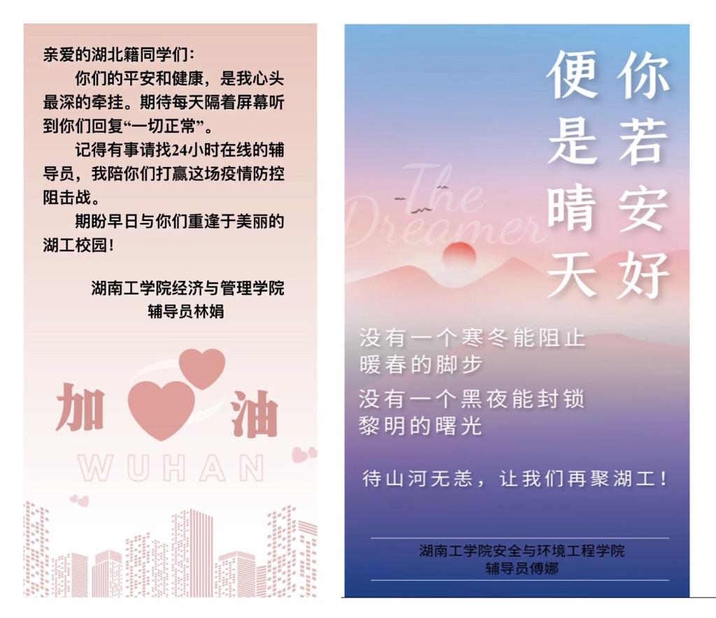 “春暖花开的日子里,让我们在美丽的湖工校园重聚”!学校各级领导和老师们纷纷给学生送去嘱咐和关切