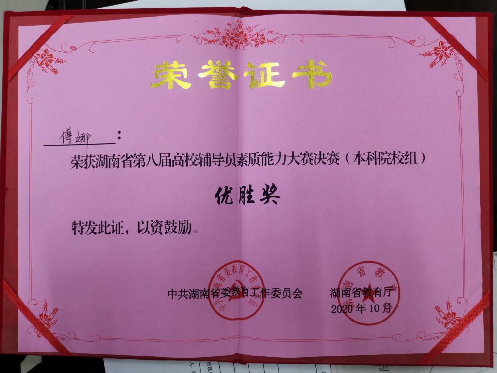 我校对此次比赛十分重视,成立备考小组,并抽调专人做好备赛辅导,经过10余天的复习准备,10月18日,经济管理学院林娟、安全与环境工程学院傅娜、机械工程学院毛艳丽三位老师在备考小组的陪同下,代表学校前往湖南科技大学参加复赛。复赛分为理论基础知识考试及班情熟知两个环节比拼,我校三位辅导员在班情熟知板块的按图索骥、鱼目混珠、描述定位三个子项目中均获得满分,我校团体分名列省第14名。10月25日,傅娜作为我校辅导员代表参加决赛,同全省123位本专科院校辅导员现场对决,斩获本科院校组优胜奖。团体、个人成绩均为我校历史最佳。