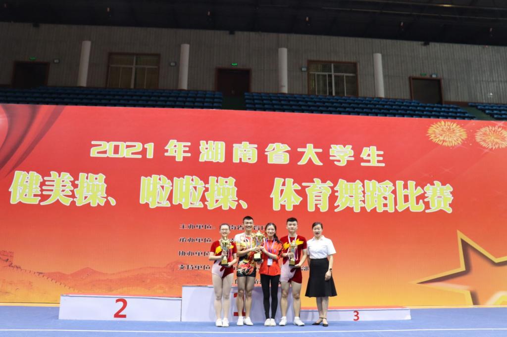 激扬青春,舞动奇迹!6月18日—20日,由湖南省教育厅举办的2021年湖南省大学生健美操比赛在湖南师范大学举行。我校健美操队,经过3天的激烈比赛,荣获学院组女子单人、男子单人、混合双人、三人操、五人操第二名、有氧踏板操第三名和学院组团体总分第二名的优异成绩。