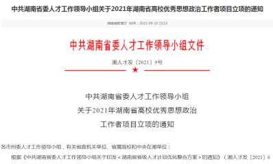 根据《中共湖南省委人才工作领导小组关于印发<湖南省省级人才计划优化整合方案>的通知》(湘人才发〔20216号)有关要求,我省高校思想政治工作质量提升工程中的“高校思想政治工作骨干队伍建设项目”更名为“高校优秀思想政治工作者项目”,并作为省级人才计划芙蓉学者奖励计划的子项目,分高校思想政治工作青年骨干建设项目、高校思想政治工作优秀团队建设项目和高校思想政治工作名师工作室建设项目3个类别实施。