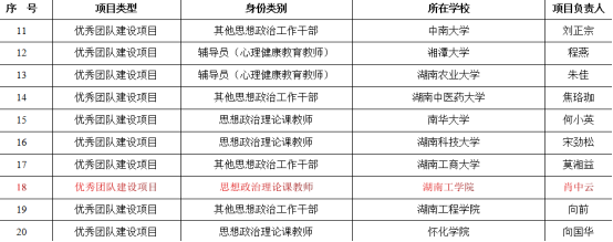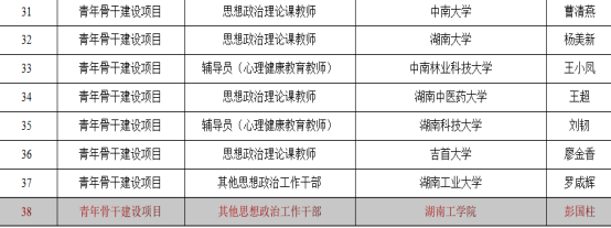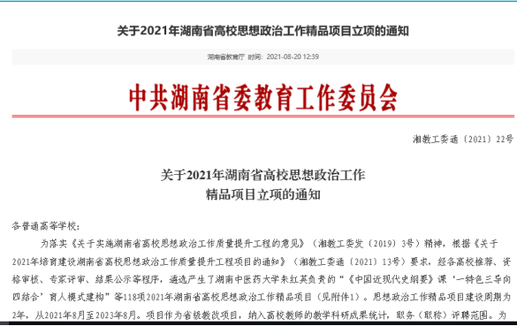 近日,从中共湖南省委人才工作领导小组下发的《关于2021年湖南省高校优秀思想政治工作者项目立项的通知》(湘人才发〔20219号)获悉,我校马克思主义学院肖中云教授获得思想政治理论课教师优秀团队建设项目立项,党委宣传部彭国柱副教授获得其他思想政治工作干部青年骨干建设项目立项。