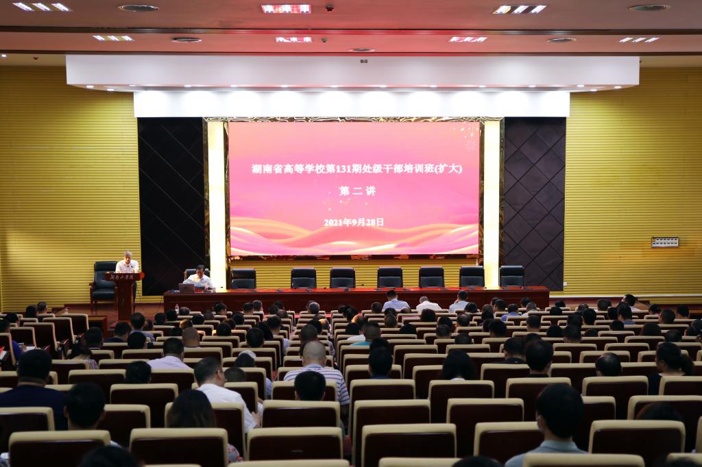 9月28日下午,湖南省高等学校第131期处级干部培训班举行第二讲,由校党委书记宋克慧主讲。校领导张平、张治春、袁勤,第131期处干班学员,学校副科以上干部,党支部书记,教研室、实验室主任聆听了讲课。