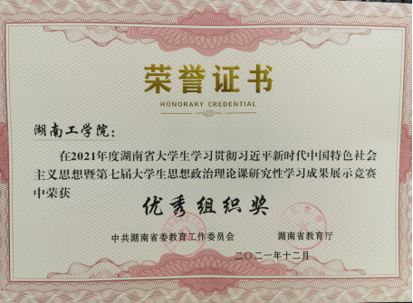 近日,从省教育厅《关于公布湖南省大学生学习贯彻习近平新时代中国特色社会主义思想暨第七届大学生思想政治理论课研究性学习成果展示竞赛结果的通知》(湘教通2021[359] 号)文件获悉,由我校环境2001班陈晓静等五位同学组成的思想政治理论课研究性学习小组荣获本科组三等奖,指导老师伍小乐荣获优秀指导老师,我校荣获优秀组织奖。