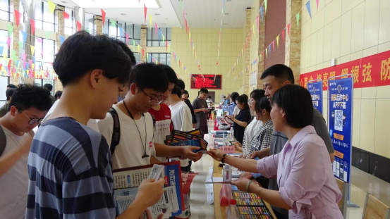 在阳光服务大厅内,参加活动的各单位在大厅内共设置多处反诈宣传点,摆放反诈展板,悬挂反诈横幅,发放反诈小册子,一对一指导下载“国家反诈中心”APP。以面对面沟通的方式面向学生开展涉及通信卡、银行卡的反诈宣传,着重对涉电诈的法律后果、危害等进行解答。