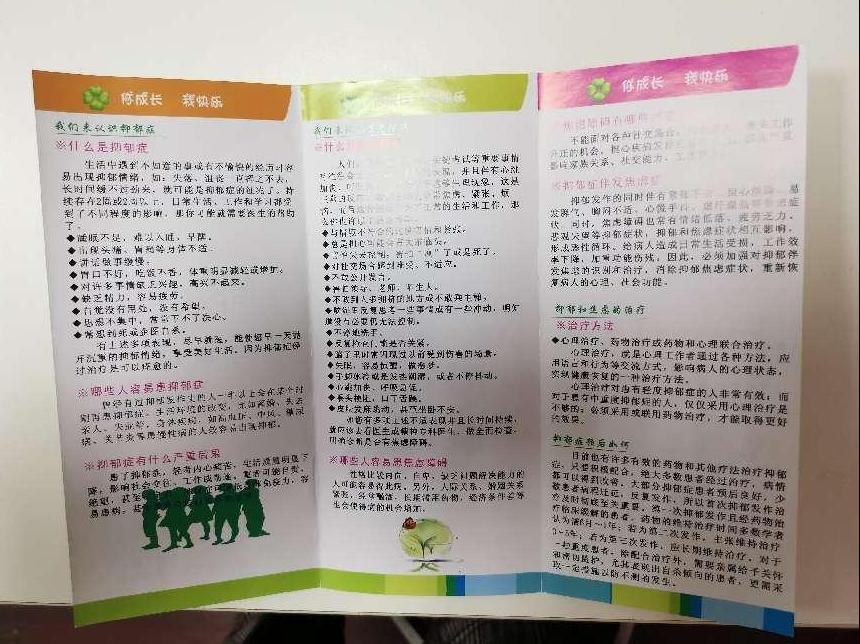 大学生成长中心针对新生适应阶段的心理成长特征,编制心理健康知识宣传册,涵盖“学习心理”“建立和谐的人际关系”“找回遗失的自信”“应对焦虑和抑郁”等主题,创设常见情景,帮助同学们提升心智,从自我成长视阈帮助大学生适应新生活,打好预防针,提升自我管理、自我服务的能力。