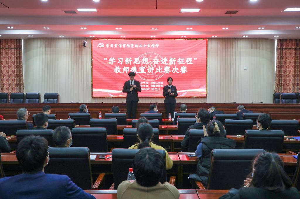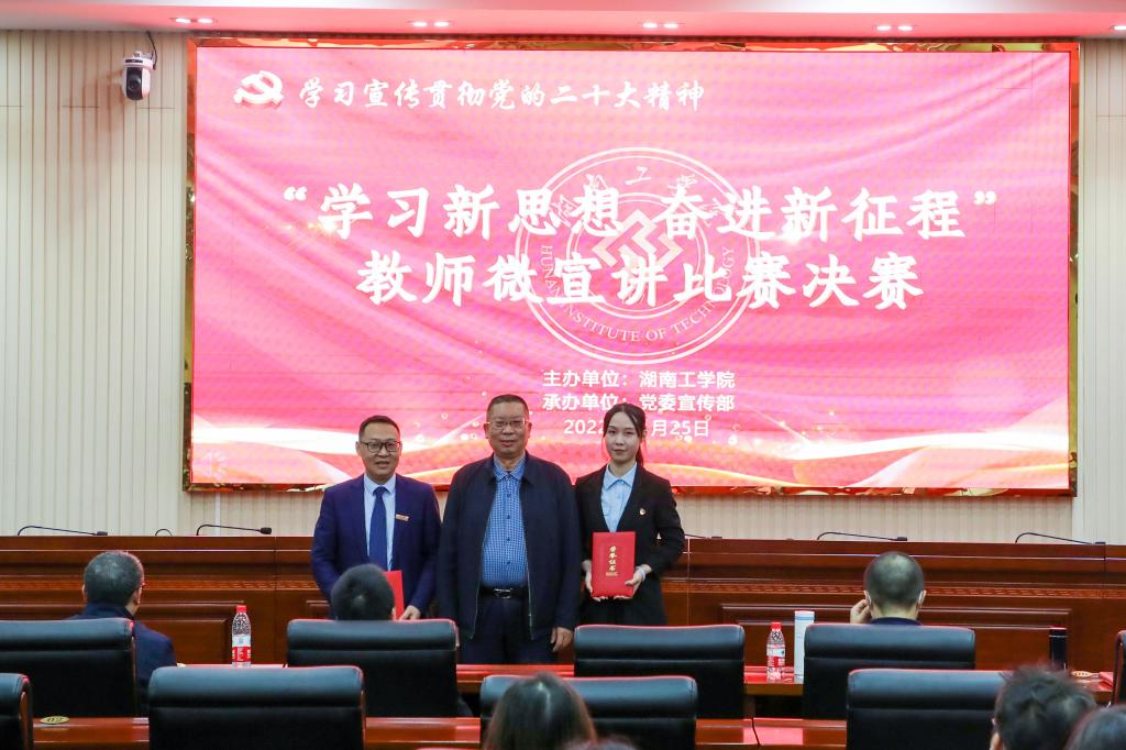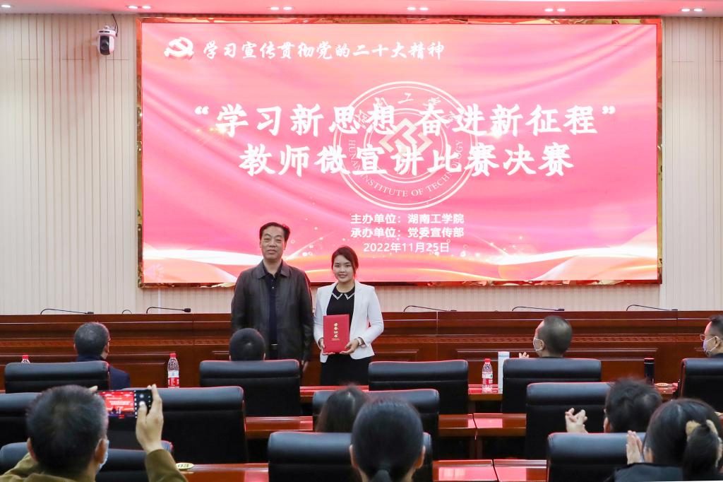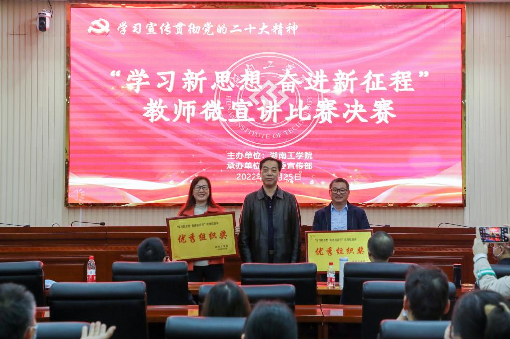 1125日,我校在教学大楼船山报告厅举办“学习新思想 奋进新征程”教师微宣讲决赛,推动全校师生深入学习贯彻党的二十大精神走深走实。校党委书记宋克慧,党委委员、副校长、宣传部、统战部部长刘龙昌出席活动并为获奖选手颁奖。