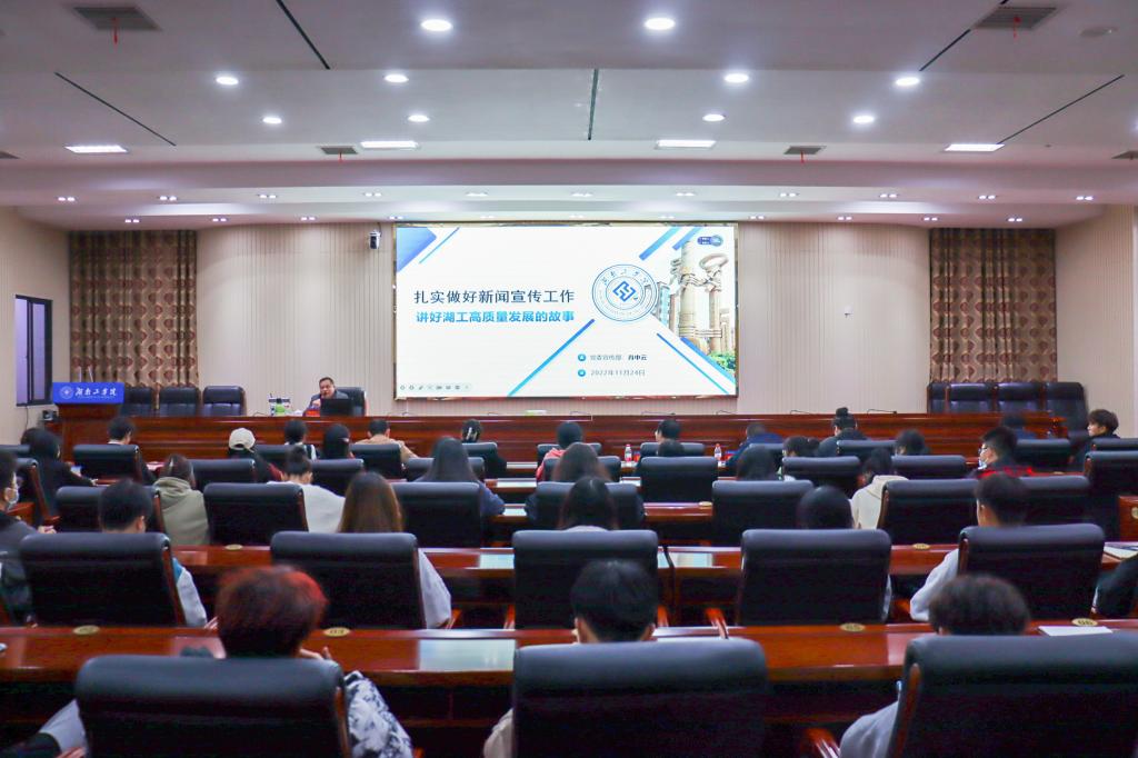 11月24日,我校第五届大学生通讯社换届大会暨第三期通讯员培训在船山报告厅举行。党委宣传部、统战部常务副部长肖中云作“扎实做好新闻宣传工作,讲好湖工高质量发展的故事”主题培训。