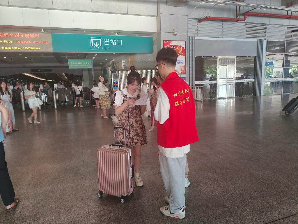 在社区的四送活动取得良好的反馈和成效之后,团队在衡阳东站设置了“四送服务”宣传点继续深入宣传服务工作。社区及学院给予了高度重视,计算机科学与工程学院党委书记黎昂、王江社区党委书记刘绍艳来到现场进行工作指导。