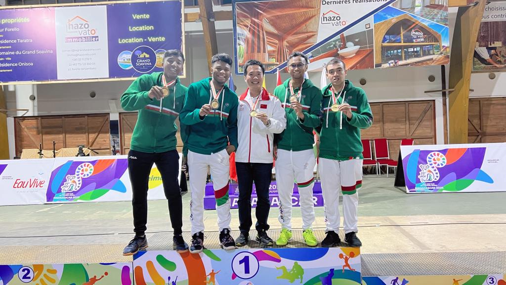 肩负祖国的使命与嘱托,赴马执教的2个月里,王海洋执教认认真真、勤勤恳恳、兢兢业业,细心观察队员们的存在的弱点,进行有针对性地改进,精湛的球技加上科学有效的训练方法,让马达加斯加国家乒乓球队队员们乒乓球技术突飞猛进,竞技水平有了显著提升。功夫不负有心人,在第11届印度洋岛国运动会乒乓球项目比赛中,获得了男子团体、男子单打、男子双打三枚金牌,混合双打一枚银牌,女子团体和混合双打两个第四,男子双打和女子双打两个第五的优异成绩,创马达加斯加乒乓球项目竞赛历史最好成绩!