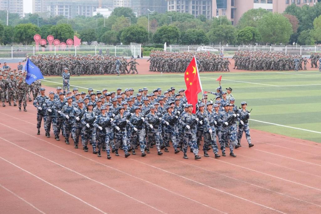 红旗飘扬,《义勇军进行曲》的歌声嘹亮。伴随着激昂的旋律,以护旗队为首的57个方阵队,昂首阔步,依次通过主席台,接受全校师生检阅。五千多名新生目光坚定,气势磅礴,以饱满的精神面貌,整齐划一的动作展示军训会操的累累战果,嘹亮的番号声响彻整个操场。