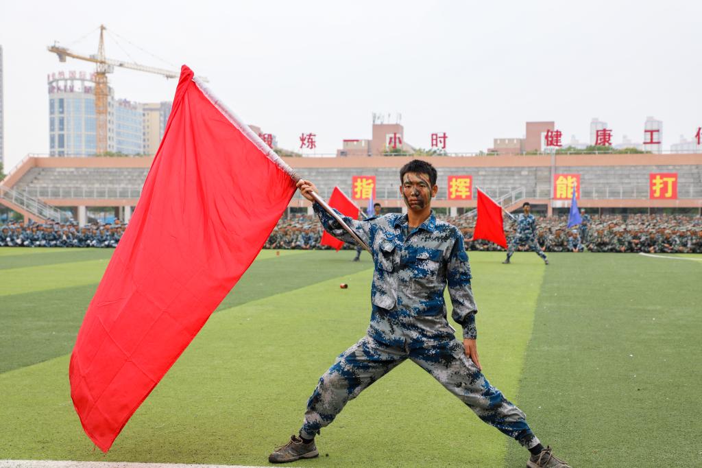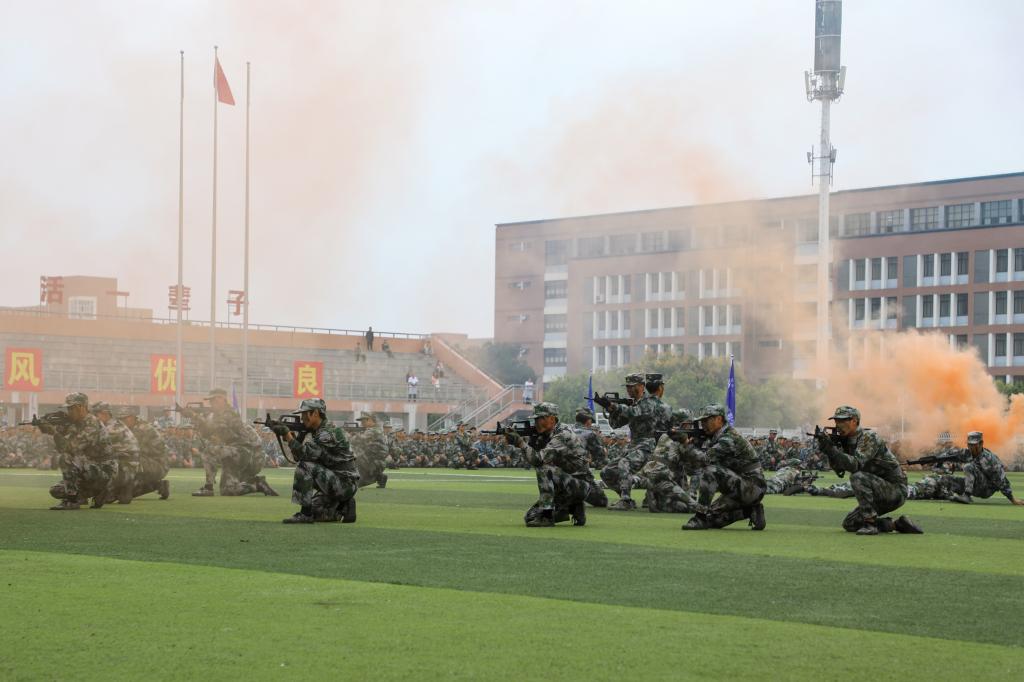 彩色烟雾弹所散发的“浓烟”弥漫在训练场上,由新生共同表演的战术方阵点燃了整个现场。匕首操、枪操、教官方阵表演,每一个摆臂抬腿的动作,每一个坚定向前的步伐,都是对青春和理想最有力的宣告。坚毅的眼神,有力的双臂,一抹抹迷彩绿里盛开了青春的恣意,共同展示出湖工学子的昂扬斗志和青春朝气。