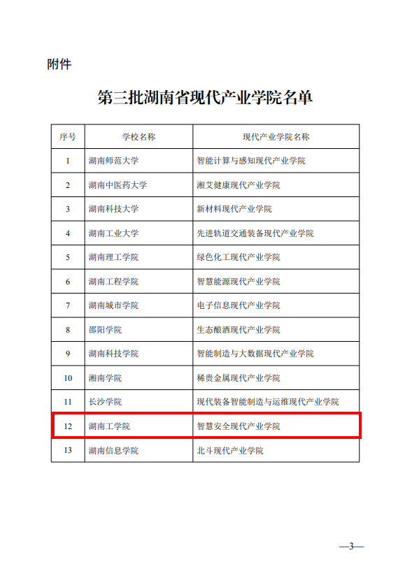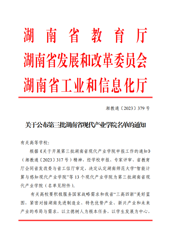 近日,湖南省教育厅、湖南省发展和改革委员会、湖南省工业和信息化厅联合发布《关于公布第三批湖南省现代产业学院名单的通知》(湘教通〔2023〕379号),我校智慧安全现代产业学院获批立项,成为我校首个湖南省现代产业学院。