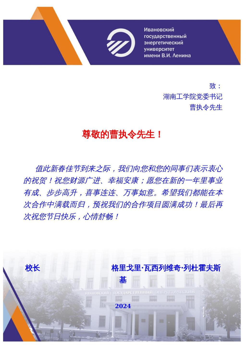 俄罗斯伊万诺沃国立动力大学向我校致新年贺信-金沙990线路检测