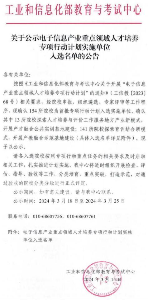 近日,国家工业和信息化部教育与考试中心公示了“电子信息产业重点领域人才培养专项行动计划实施单位入选名单”,我校成功入选首批产教融合示范基地培育实施单位。