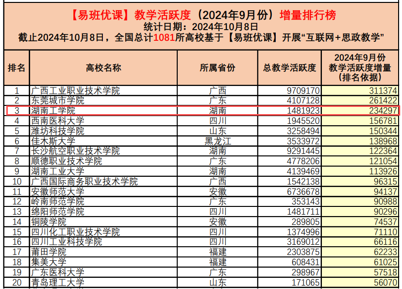 近日,教育部易班发展中心公布了2024年9月“易班优课”教学活跃度增量排行榜,我校在全国1081所高校中脱颖而出,在全国排名中位列第三、湖南省高校中位列第一,创历史新高。