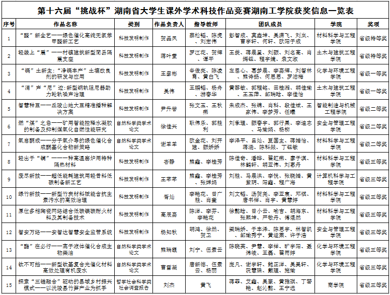 我校参加第十六届“挑战杯”湖南省大学生课外学术科技作品竞赛获奖信息