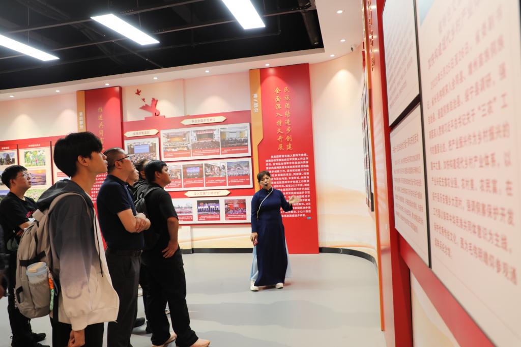 在讲解员的引导下,师生们详细了解了体验馆的建设背景和展区布局。该体验馆依托雨花非遗馆资源优势,设立民族交融与民族工作主题展区,通过非遗项目的文化符号化展示,彰显中华文化多元一体的深厚底蕴,突出了非遗保护与传承在铸牢中华民族共同体意识中的重要作用。