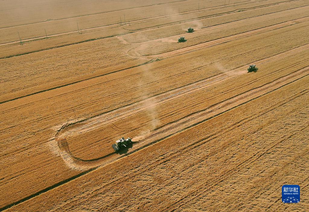 在河南省黄泛区农场九分场的麦田里,农机手操作收割机收获小麦(2021年6月6日摄,无人机照片)。新华社记者 李安 摄